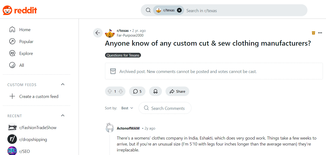 Reddit is a good place to find reputable manufacturing companies that can deliver. You can use it in two ways: ask for recommendations or seek the opinions of other fashion entrepreneurs about a manufacturer.