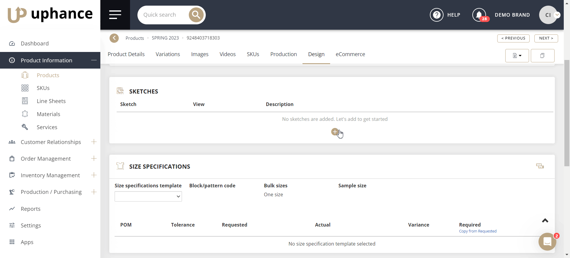Uphance makes it easy to create tech packs, which in turn enables you to communicate your design ideas to a manufacturer. Tech packs, simply, are design documents that contain key features and information about your product ideas, such as fashion flats (sketches), size specifications, care instructions, and manufacturing notes.
